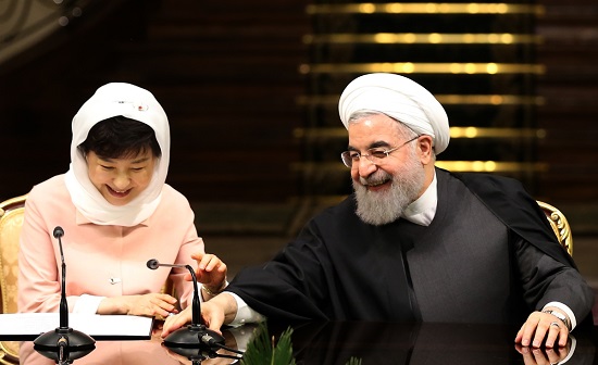 روزنو :19یادداشت تفاهم و سند همكاری بین جمهوری اسلامی ایران و كره جنوبی با حضور حسن روحانی و پارك گئون هی روسای جمهوری دو كشور در مجموعه تاریخی - فرهنگی سعدآباد تهران بین مقامات جمهوری اسلامی ایران و كره جنوبی به امضاء رسید. در این تصویر آقای روحانی میکروفون خانم رییس جمهور را بررسی می کند تا در محل مناسبی قرار داشته باشد.