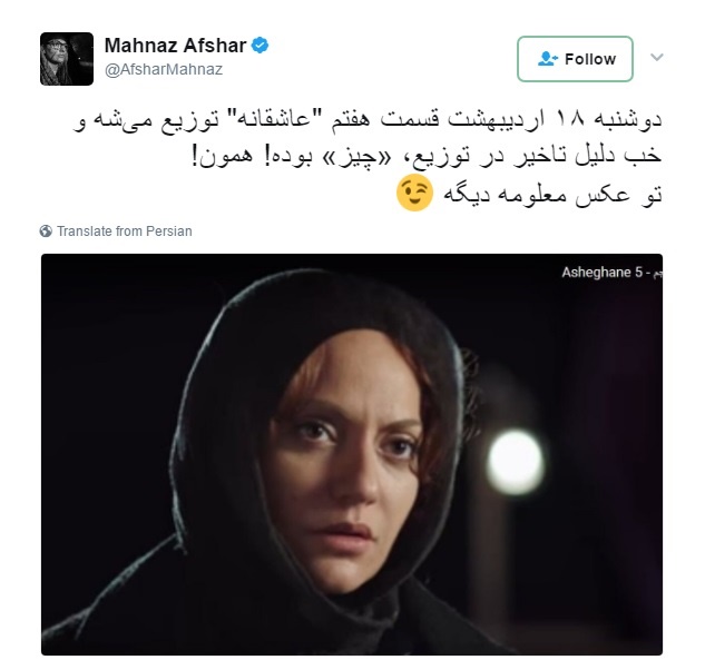 روزنو :مهناز افشار در توییتر نوشت: «دوشنبه ۱۸ اردیبهشت قسمت هفتم «عاشقانه» توزیع می‌شه و خب دلیل تاخیر در توزیع، «چیز» بوده! همون! تو عکس معلومه دیگه»
