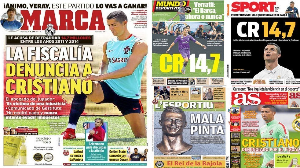 روز گذشته (سهشنبه) دادستانی شهر مادرید از رونالدو به اتهام چهار فقره کلاهبرداری مالیاتی مجموعاً به ارزش 14.7 میلیون یورو شکایت کرد که این خبر سوژه داغی بوده است که اکثر نشریات اسپانیایی و غیر اسپانیایی روی جلد بردهاند. در این میان اما نکته جالب این است که دو نشریه آس و مارکا که حامی رئال مادرید هستند، عکس مربوط به خبر کلاهبرداری رونالدو را با پیراهن تیم ملی پرتغال منتشر کردهاند.