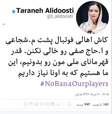 ترانه علیدوستی بازیگر مطرح کشور با انتشار متنی در صفحه توییتر خود،نسبت به محرومیت احسان حاج صفی و مسعود شجاعی از تیم ملی واکنش نشان داد. شجاعی و حاج صفی به دلیل بازی مقابل تیم مکابی،با محرومیت از حضور در تیم ملی مواجه شده اند.