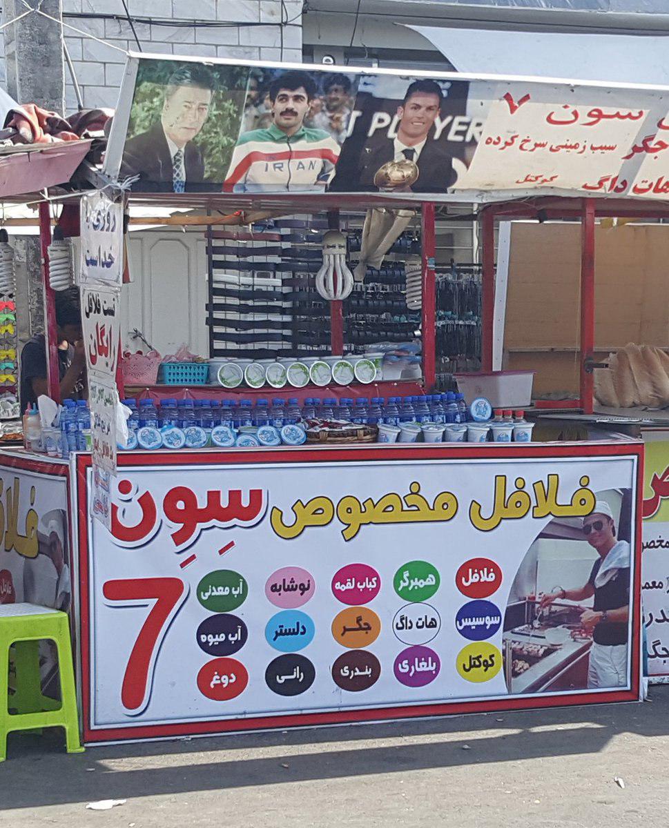یک فروشنده فلافل که به چهره های فوتبالی از جمله رونالدو،سیروس قایقران و ناصر حجازی علاقمند است محل کسب و کار خود را با عکس این فوتبالیست ها تزیین کرده است.