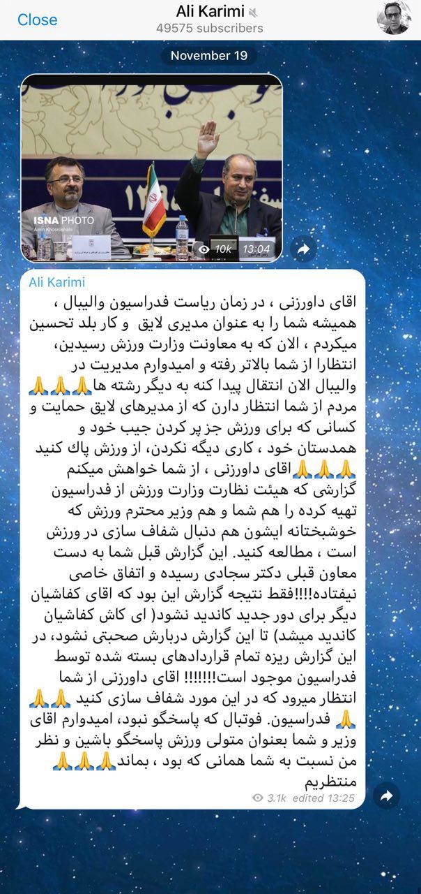 در ادامه کشمکش‌های زیاد بین فدراسیون فوتبال و علی کریمی، جادوگر بار دیگر اقدام به نوشتن یک مطلب در کانال تلگرامی خود کرد و این بار از محمدرضا داورزنی و وزارت ورزش درخواست پیگیری دارد.
