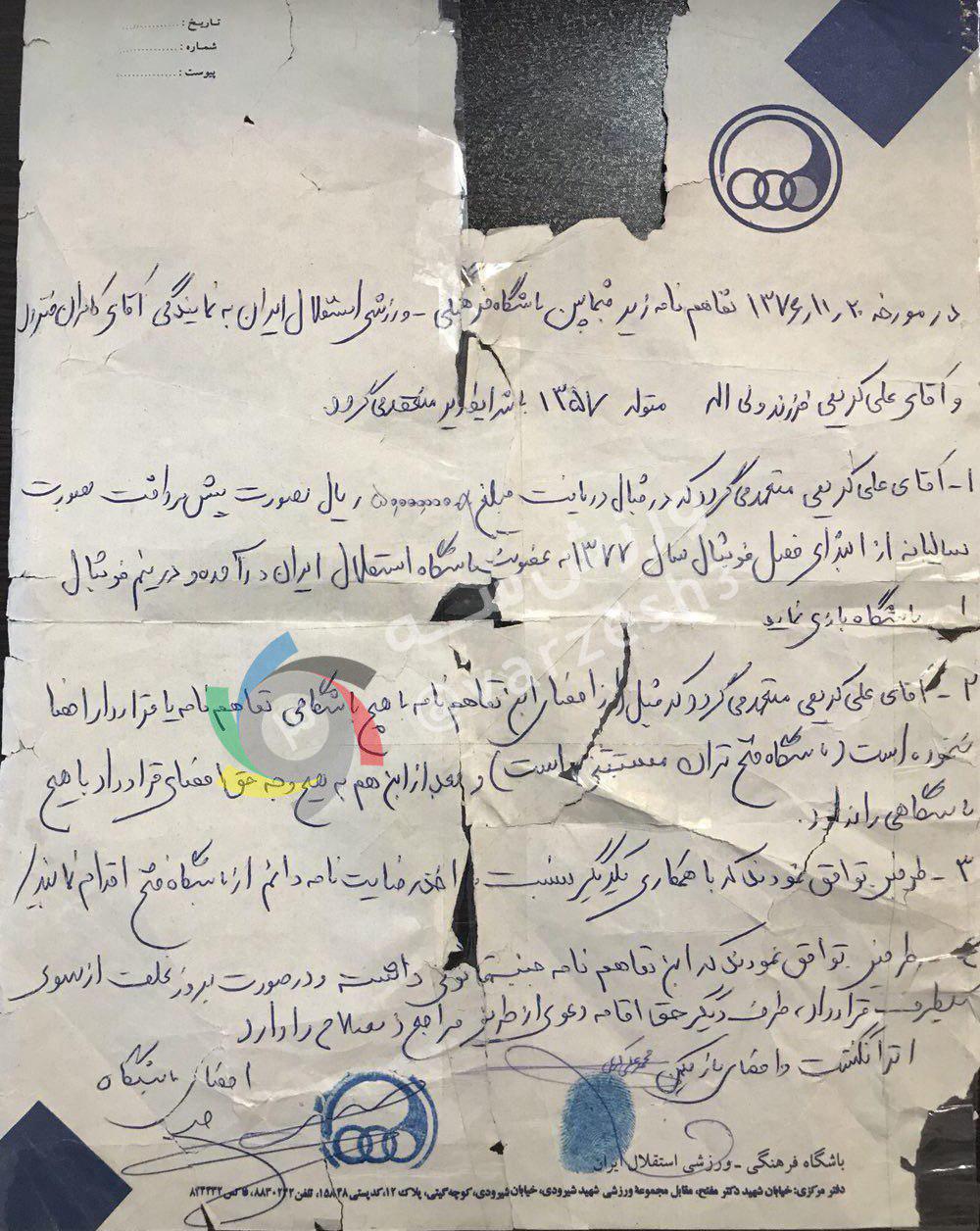 تصویر این قرارداد که در بهمن ماه سال ۷۶ از طرف منزوی به نمایندگی از باشگاه استقلال و علی کریمی به مبلغ ۵ میلیون تومان به امضا رسیده، در اختیار ورزش سه قرار گرفته است.