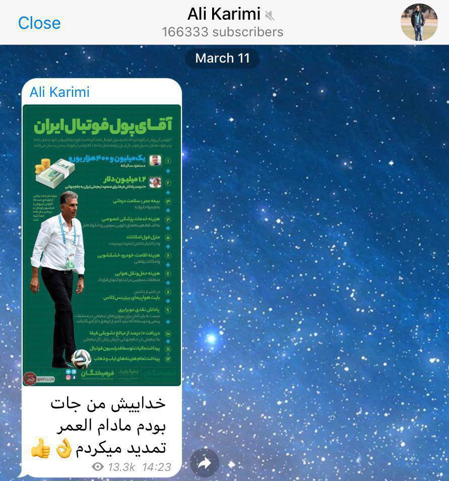 در شرایطی که قرارداد کی روش با فدراسیون فوتبال بعد از جام جهانی به اتمام می رسد برخی ها بدنبال تمدید قرارداد این مربی هستند. کریمی هم به همین واسطه دوباره با انتشار عکسی در صفحه اجتماعی خود به کی روش طعنه زده است.