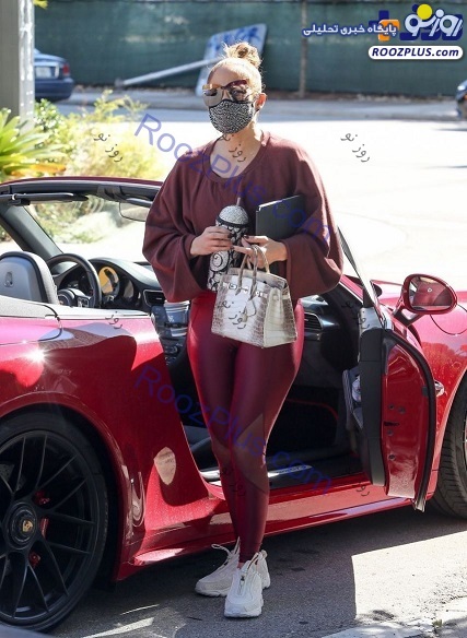 جنیفر لوپز مثل همیشه ماگ سفری پر زرق و برق خود را به همراه داشت و با یک سوییشرت شرابی که آن را با یک لگینگ قرمز تیره به تن کرده بود و یک ماسک پرزرق و برق وارد باشگاه نامزدش شد.