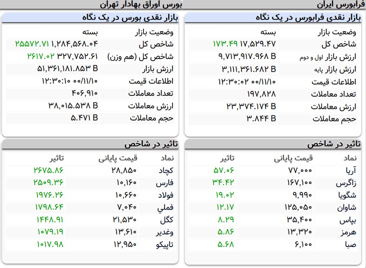نمادهای پلیمر آریا ساسول (آریا)، پتروشیمی زاگرس (زاگرس)، پتروشیمی تندگویان (شگویا)، پالایش نفت لاوان (شاوان)، بیمه پاسارگاد (بپاس)، فولاد هرمزگان جنوب (هرمز) و شرکت سرمایه گذاری صبا تامین (صبا) تاثیر مثبت بر شاخص فرابورس همراه بودند.