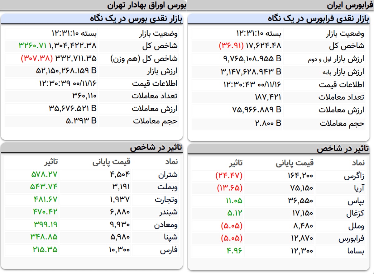 در معاملات امروز معامله گران ۵ میلیارد و ۴۷۲ میلیون برگ سهم و اوراق در بیش از ۳۶۲ هزار نوبت به ارزش بیش از ۳۶۲۶ میلیارد تومان دادوستد کردند. شاخص کل در پایان معاملات با ۲۵ صدم درصد رشد در مقایسه با روز کاری قبل جایگاه خود در محدوده یک میلیون و ۳۰۰ هزار واحدی را حفظ کرد. نمادهای شتران، وبملت، وتجارت، شنبدر، ومعادن، شپنا و فارس بیشترین تاثیر مثبت بر شاخص کل را داشتند و نمادهای خودرو، خساپا، شتران، وتجارت، شنبدر، فملی و انرژی ۳ نیز جزو پرتراکنشترین نمادهای بورس بودند.