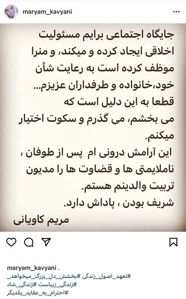 مریم کاویانی، بازیگر سینما و تلویزیون در یک پست اینستاگرامی به اظهارات رامین مهمانپرست، دیپلمات ایرانی و سخنگوی اسبق وزارت خارجه در یک گفتگو ویدئویی درباره حواشی زندگی مشترک با وی پاسخ داد.