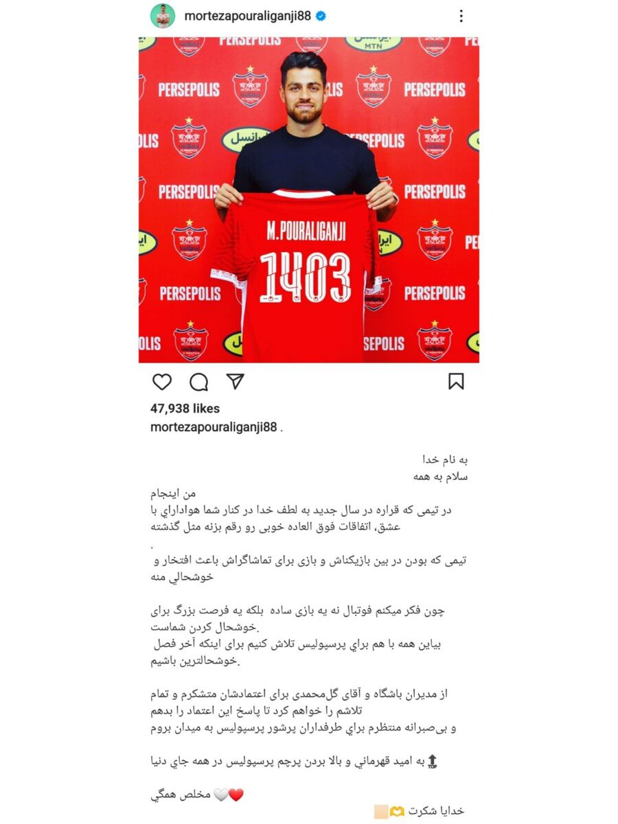 پورعلی گنجی نوشت: «من اینجام. در تیمی که قراره در سال جدید به لطف خدا در کنار شما هوادارای با عشق، اتفاقات فوق العاده خوبی رو رقم بزنه مثل گذشته. تیمی که بودن در بین بازیکناش و بازی برای تماشاگراش باعث افتخار و خوشحالی منه چون فکر میکنم فوتبال نه یه بازی ساده بلکه یه فرصت بزرگ برای خوشحال کردن شماست. بیاین همه با هم برای پرسپولیس تلاش کنیم برای اینکه آخر فصل خوشحالترین باشیم. از مدیران باشگاه و آقای گل‌محمدی برای اعتمادشان متشکرم و تمام تلاشم را خواهم کرد تا پاسخ این اعتماد را بدهم و بی‌صبرانه منتظرم برای طرفداران پرشور پرسپولیس به میدان بروم. به امید قهرمانی و بالا بردن پرچم پرسپولیس در همه جای دنیا. مخلص همگی. خدایا شکرت»