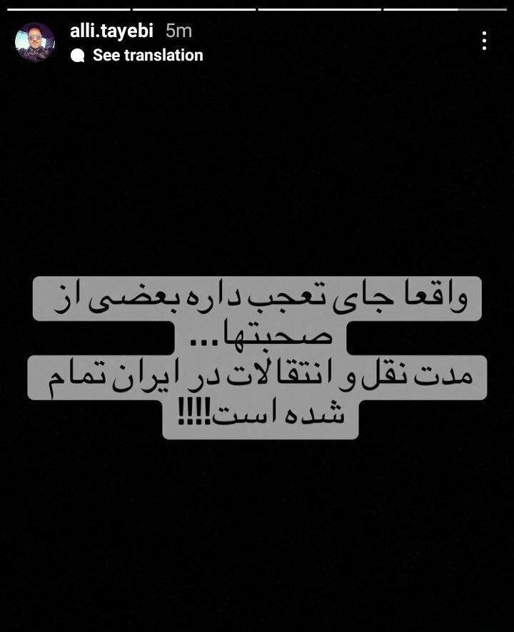 طیبی در این استوری نوشت: «واقعا جای تعجب داره بعضی صحبتها، مدت نقل و انتقالات در ایران تمام شده.»