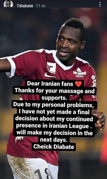 در این پیام که با تصویری از دیاباته با پیراهن قرمز هم وجود دارد، آمده است: «هواداران عزیز ایرانی؛ از پیام و حمایت‌هایتان تشکر می‌کنم. به خاطر مشکلات شخصی هنوز تصمیم نهایی را برای ادامه حضور در لیگ ایران نگرفته‌ام. در چند روز آینده تصمیمم را می‌گیرم.»