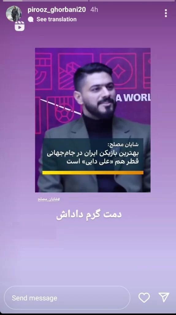 روزنو :پیروز قربانی بازیکن سابق تیم استقلال با انتشار یک استوری در صفحه شخصی اش از موضع اخیر شایان مصلح درباره علی دایی حمایت همه جانبه کرده است.