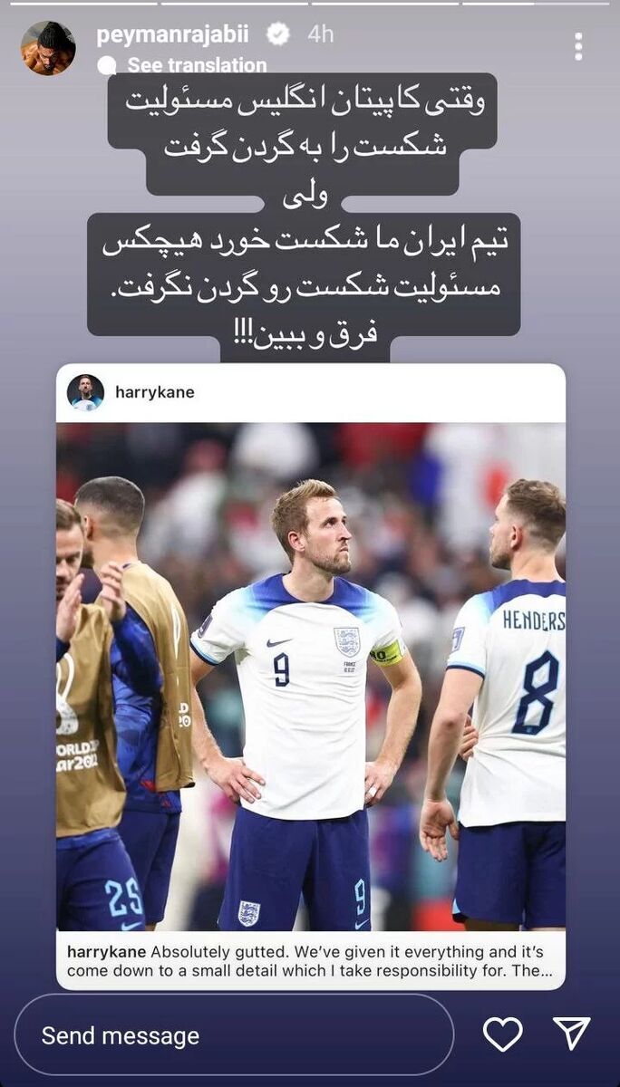 پیمان رجبی در این خصوص نوشت: وقتی کاپیتان انگلیس مسئولیت شکست را به گردن گرفت ولی تیم ایران ما شکست خورد هیچکس مسئولیت شکست را گردن نگرفت. فرق رو ببین!
