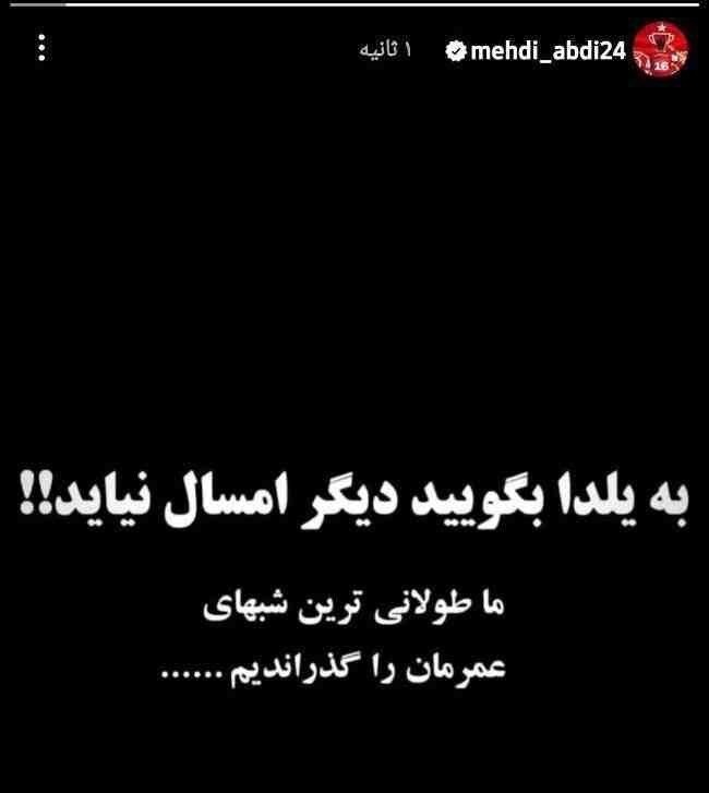 مهدی عبدی، مهاجم باشگاه پرسپولیس در آستانه شب یلدا پیامی را در صفحه شخصی اینستاگرامش منتشر کرد. عبدی در این خصوص نوشت: به یلدا بگویید که دیگر امسال نیاید. ما طولانیترین شبهای عمرمان را گذراندیم.