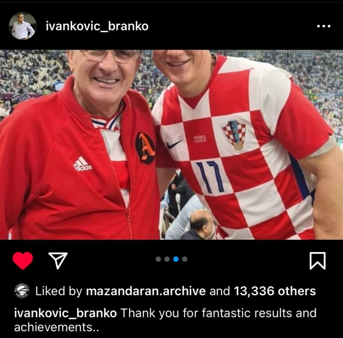 برانکو ایوانکوویچ سرمربی اسبق تیم ملی ایران و پرسپولیس این روزها در قطر حضور دارد و بازی های جام جهانی را از نزدیک تماشا میکند. او شب گذشته با حضور در استادیوم لوسیل بازی کرواسی و آرژانتین را تماشا کرد و پس از این دیدار پستی در اینستاگرامش منتشر کرد.