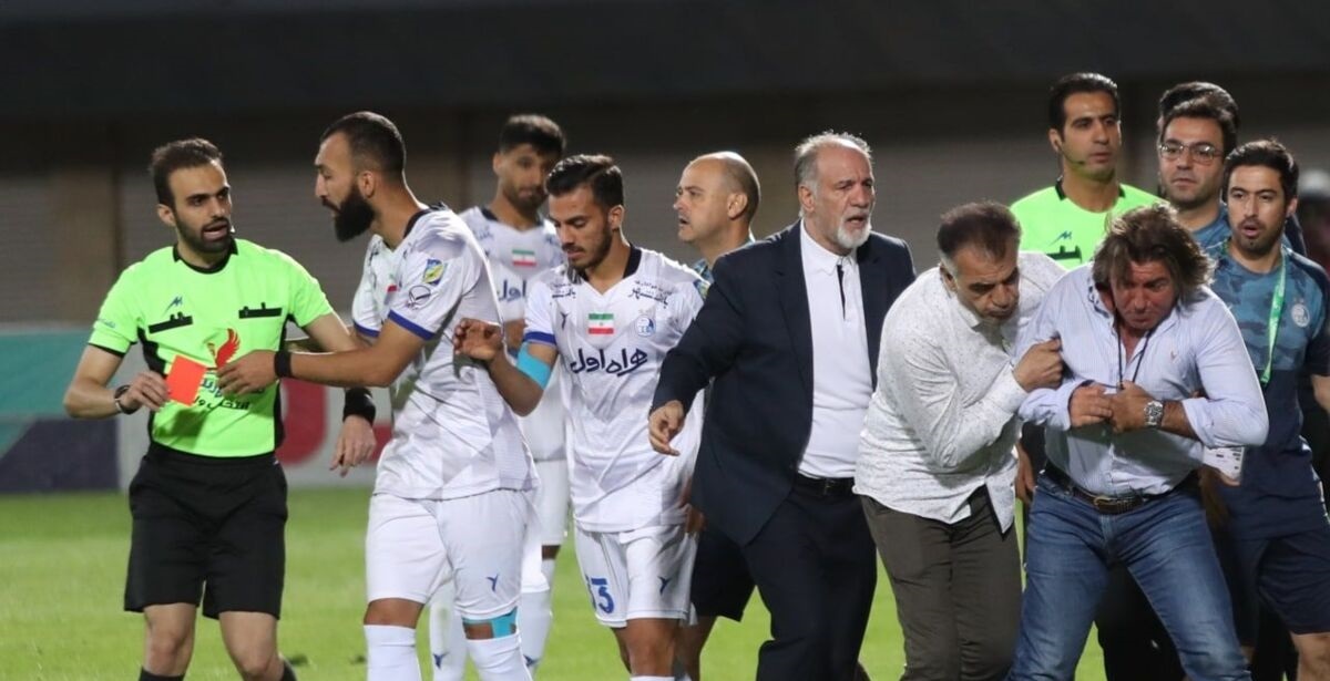 پس از اعلام خطای پنالتی داور به سود استقلال با حرکت عجیب امین قاسمینژاد، بحثهای مربوط به آن روی پیست تارتان، بین کادر فنی گل گهر سیرجان و استقلال شروع شد .اعضای کادر فنی تیم گل گهر سیرجان درصدد بودند تا نسبت به تصمیم داور مسابقه (امیر عرب براقی) انتقاد و اعتراض کنند و از سوی دیگر ریکاردو ساپینتو سعی داشت از تصمیم درست داور حمایت کند. این تنشها موجب شد تا درگیری دیگری جدا از اعتراض کادر فنی گل گهر سیرجان به داور روی محوطه بیرونی زمین چمن استارت بخورد.