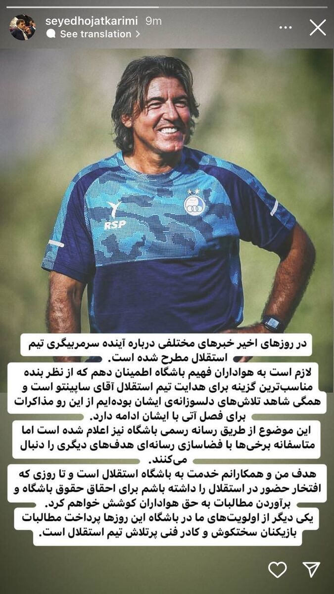 با گذشت چند ساعت از اطلاعیه باشگاه استقلال، حجت کریمی، سرپرست مدیرعاملی باشگاه، نیز در یک استوری اینستاگرامی مطالبی را در این خصوص بیان کرده است.