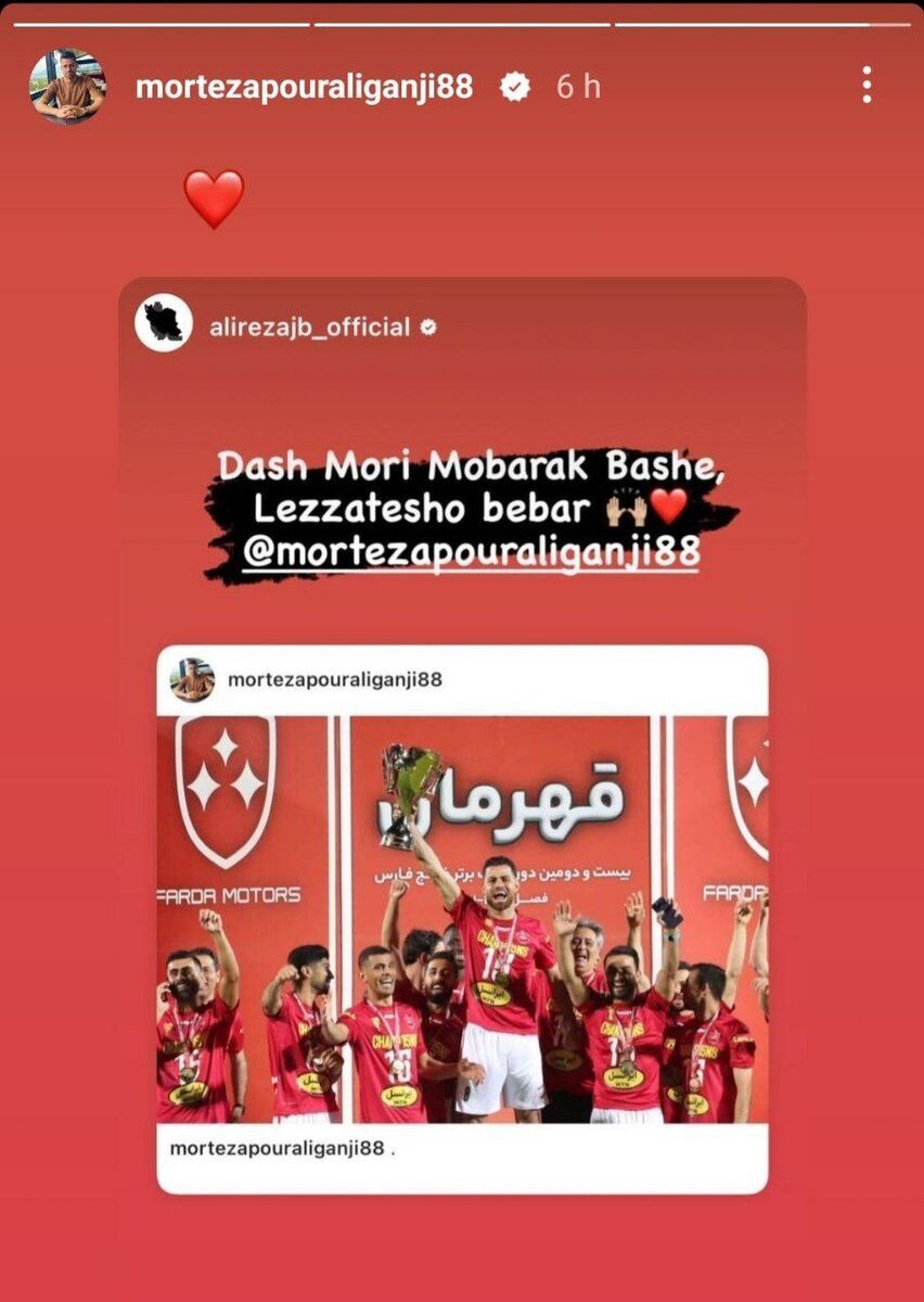 علیرضا جهانبخش پس از قهرمانی پرسپولیس در لیگ برتر با انتشار تصویری از قهرمانی سرخپوشان به مرتضی پورعلیگنجی تبریک گفت و اکنون مدافع پرسپولیس نیز با انتشار پیامی به کاپیتان تیم ملی پاسخ داده است.