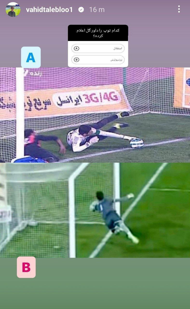 حالا طالب‌لو با کنار هم گذاشتن تصویر آن صحنه و تصویری از لحظه عبور توپ از خط دروازه پرسپولیس، یک نظرسنجی کنایه آمیز را منتشر کرده و از دنبال‌کننده‌های خود پرسیده که به نظر شما کمک داور کدام یک از این دو صحنه را گل اعلام کرده است؟