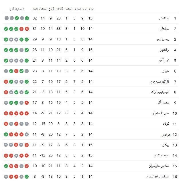 جدول لیگ برتر فوتبال در پایان بازی‌های امروز: