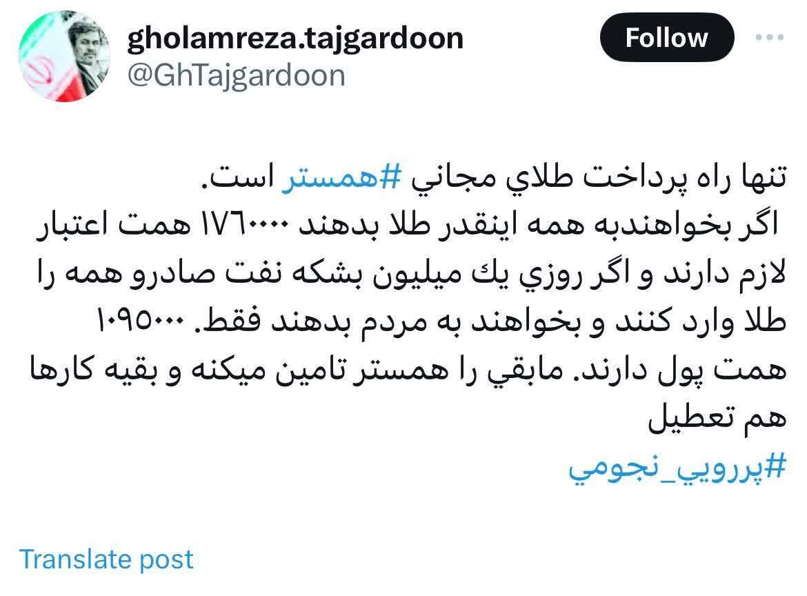 کنایه تاجگردون به وعده تازه زاکانی با هشتگ پررویی نجومی!
