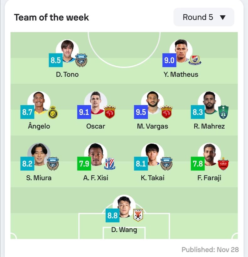 نکته جالب اینکه ۸ بازیکن این تیم از تیم‌های شرقی هستند و کاوازاکی فرونتاله با سه بازیکن از بیشترین نماینده برخوردار است. این تیم در دیدار حساس توانست با سه گل بوریرام یونایتد را شکست دهد و به رتبه چهارم صعود کند.