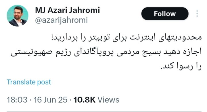 برترینها: آذری جهرمی، وزیر سابق ارتباطات با انتشار توییتی از مسئولین درخواست کرد تا شبکه ایکس(توییتر) را رفع فیلتر کنند.