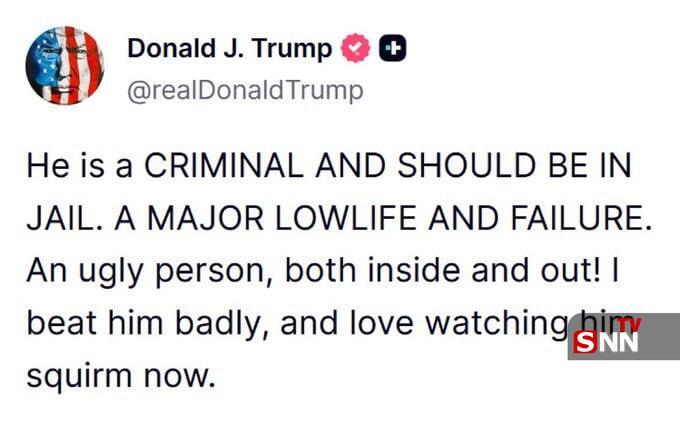 ترامپ در ادامه این مطلب کوتاه نوشت: «او (بایدن) یک آدم پست و شکست‌خورده بزرگ است؛ یک آدم زشت، چه از درون و چه از بیرون!»