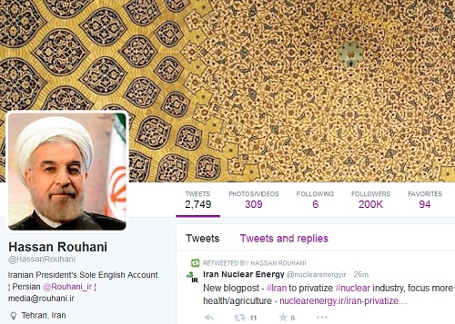 200 هزار نفر حساب توییتر رئیس جمهور ایران را دنبال می کنند و تاکنون 2749 توییت از سوی این حساب منتشر شده است.