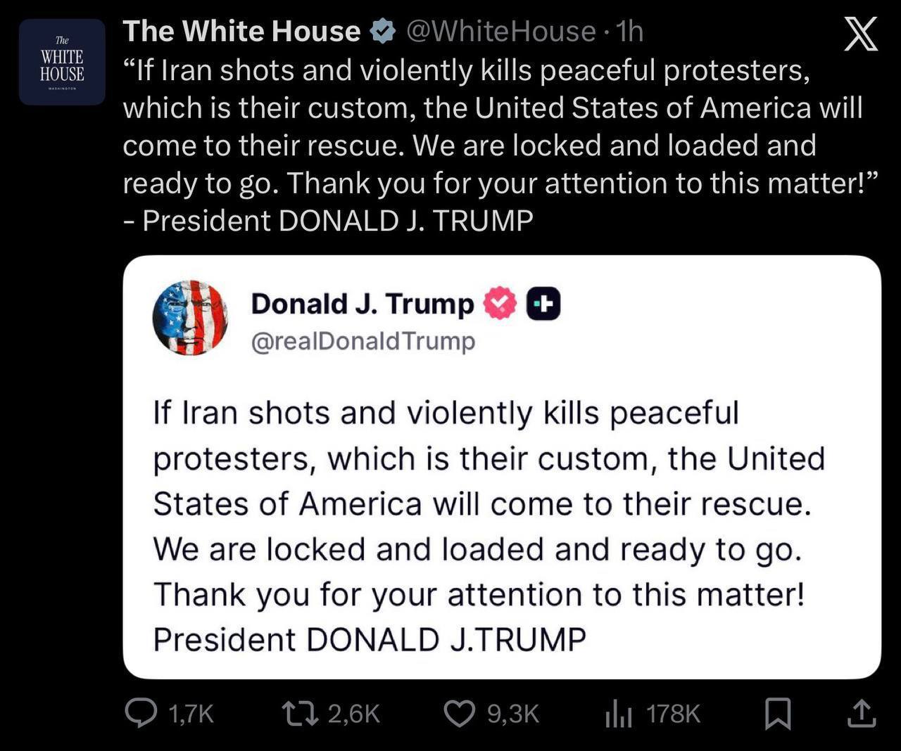 روزنو :در پی پیام هشدارآمیز ترامپ درباره اعتراضات ایران حساب رسمی کاخ سفید پیام او را بازنشر کرد.