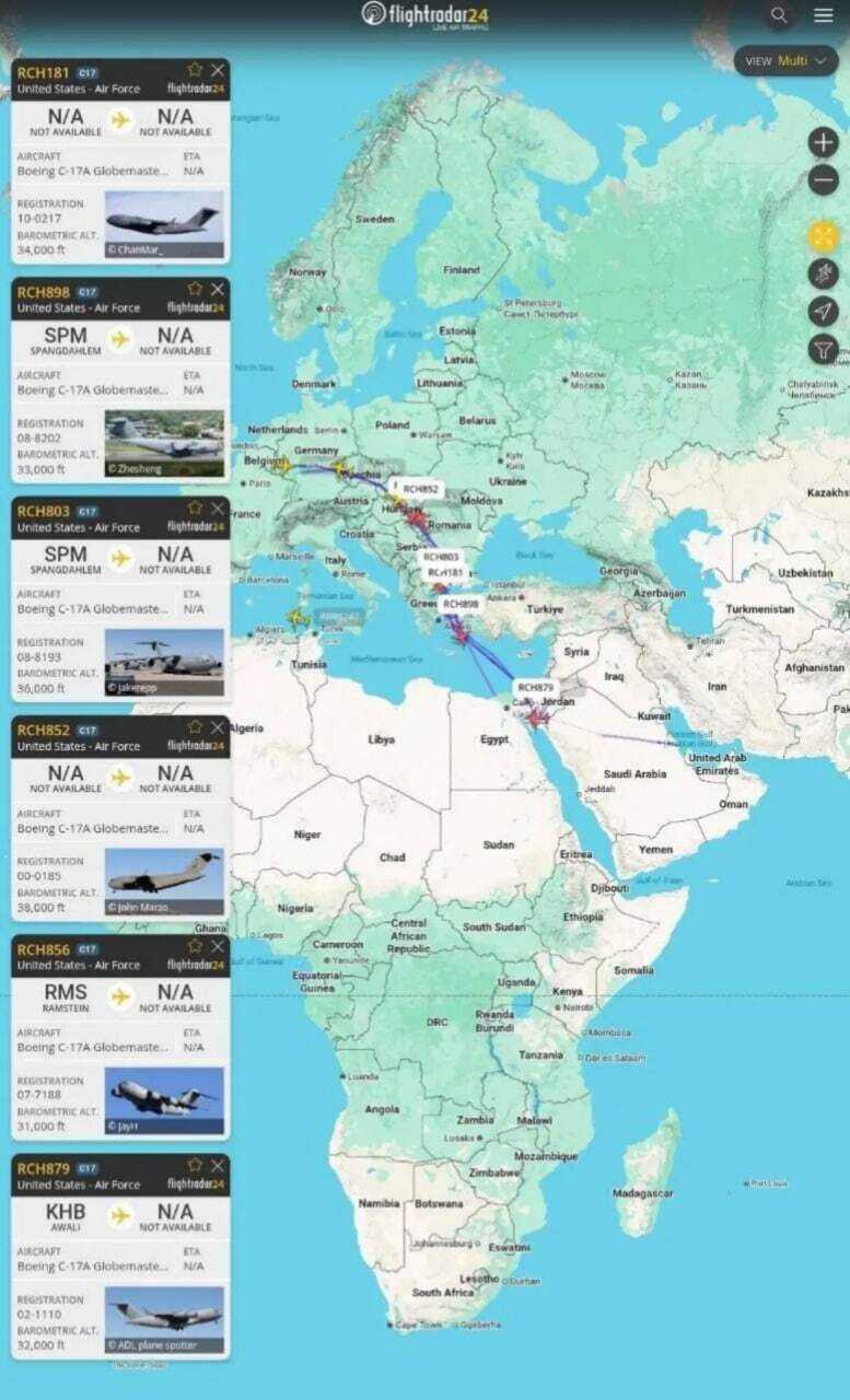 بر اساس جدیدترین داده ها، ۱۶ فروند هواپیمای ترابری C-۱۷A در ساعات اخیر بین پایگاه اسپنگدالم در آلمان و دو پایگاه آمریکا در خاورمیانه پرواز کرده‌اند.