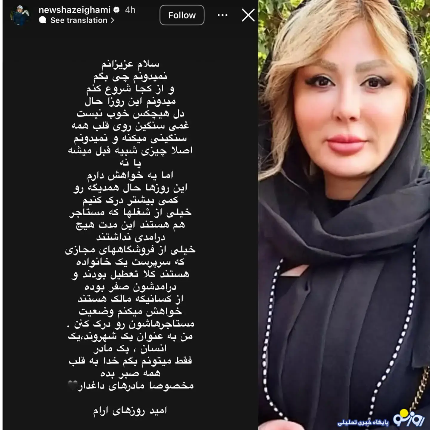 نیوشا ضیغمی، بازیگر سینما و تلویزیون، با انتشار استوری‌ای در صفحه شخصی خود از مردم خواست با توجه به اتفاقات اخیر در کشور و کاهش درآمد بسیاری از هموطنان، بیش از گذشته هوای یکدیگر را داشته باشند.